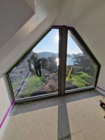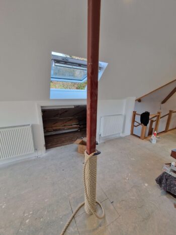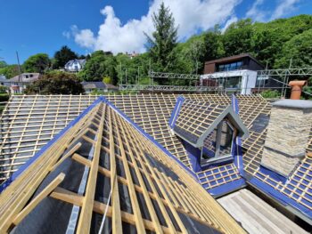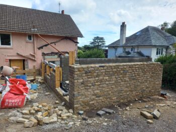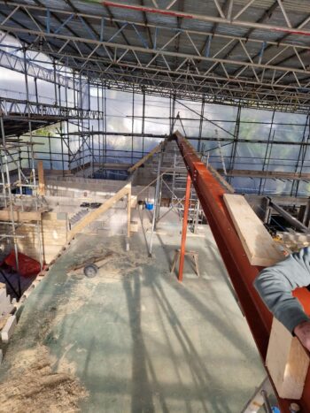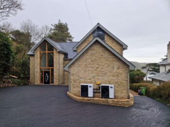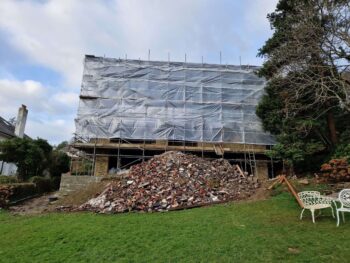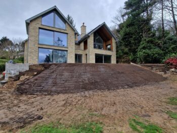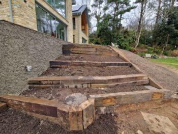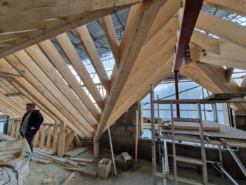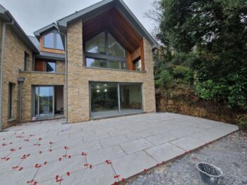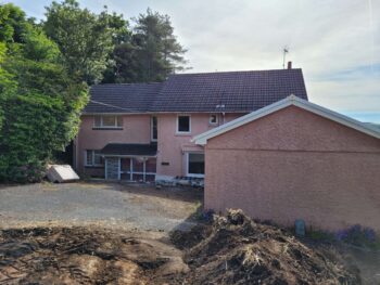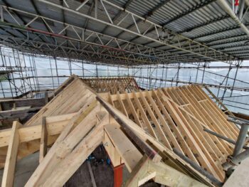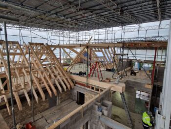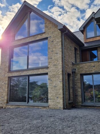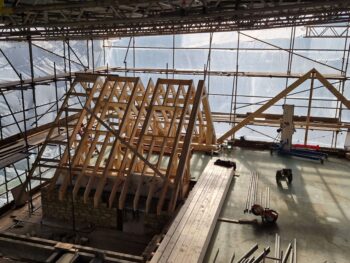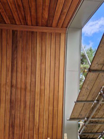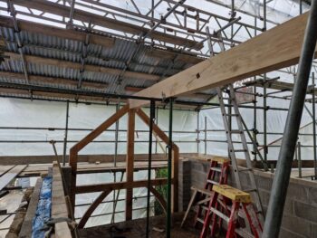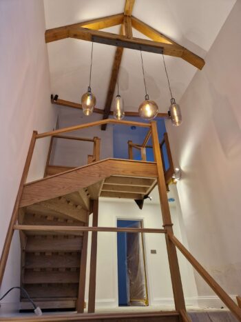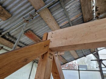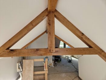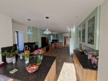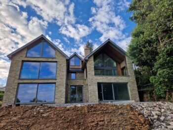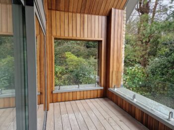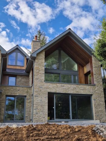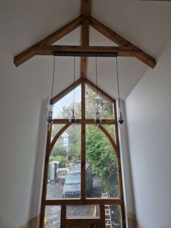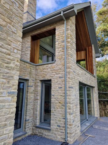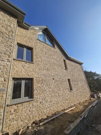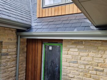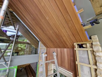 Material selection was central to achieving the desired blend of tradition and contemporary style.  We chose Green oak,  prepared and cut on site, to honour the home’s heritage and provide warmth.  Stone sourced from the Cotswolds added character,  while bespoke aluminium facia, soffit and guttering introduced a modern touch.  African wood cladding added richness and texture to the exterior.    Each element was carefully considered to balance warmth and timeless charm with modern design.