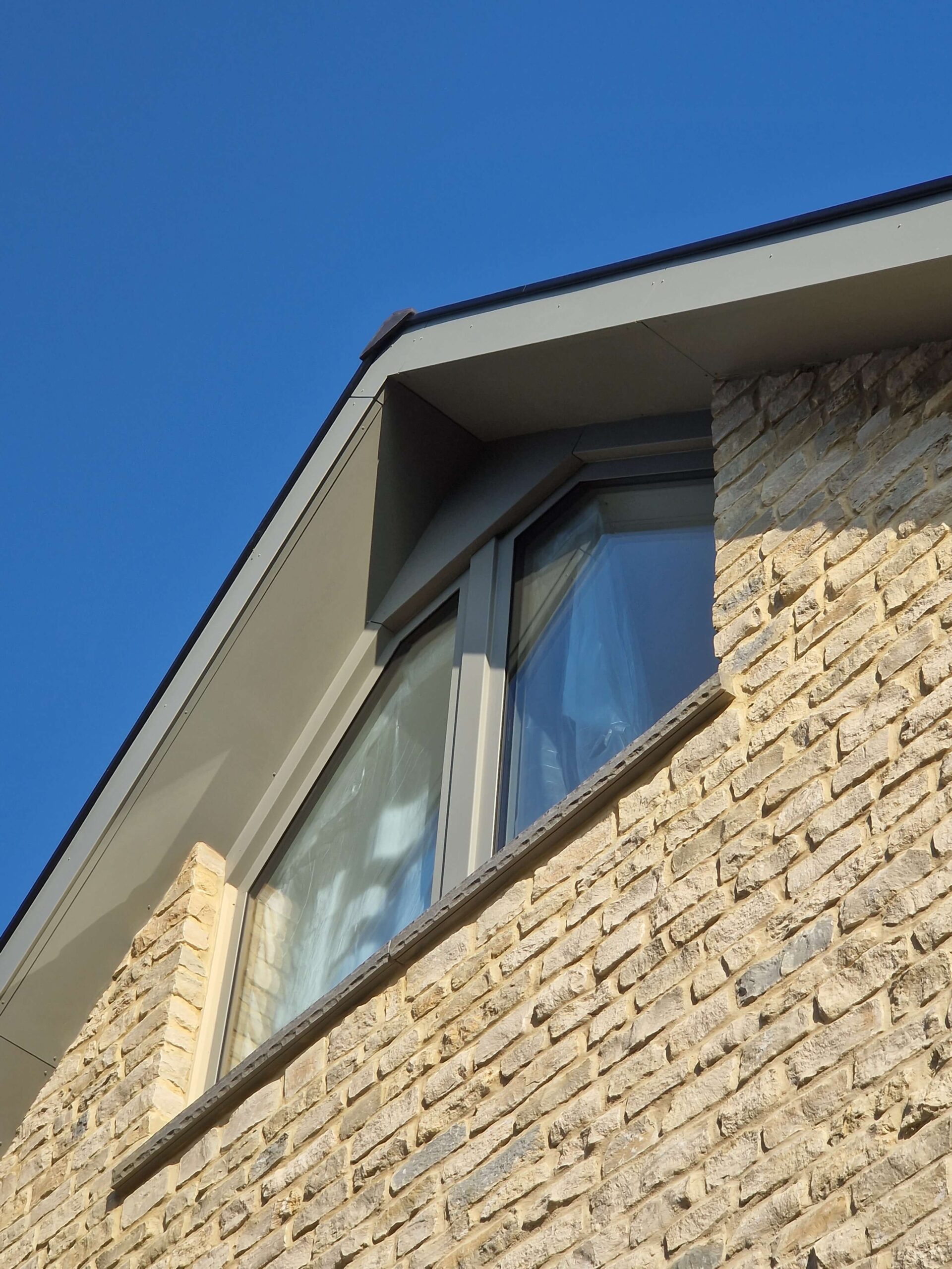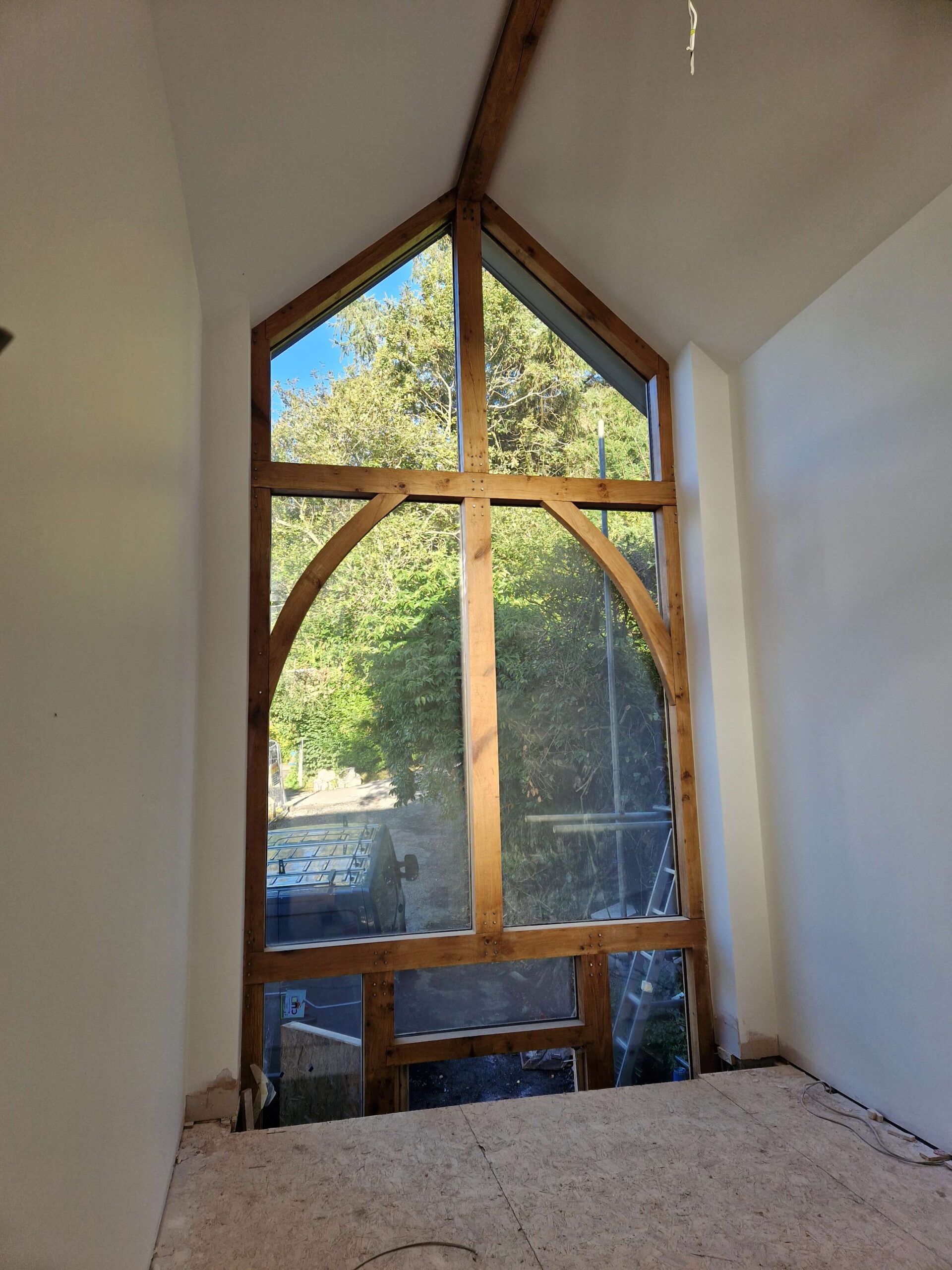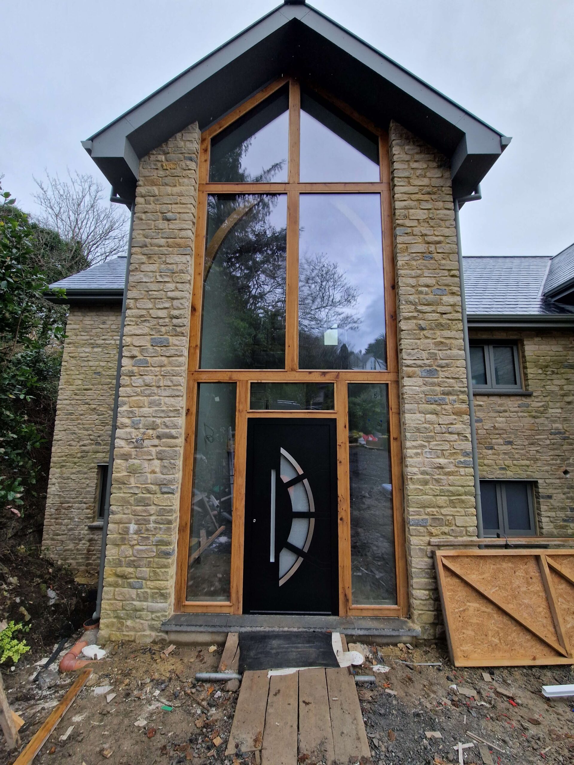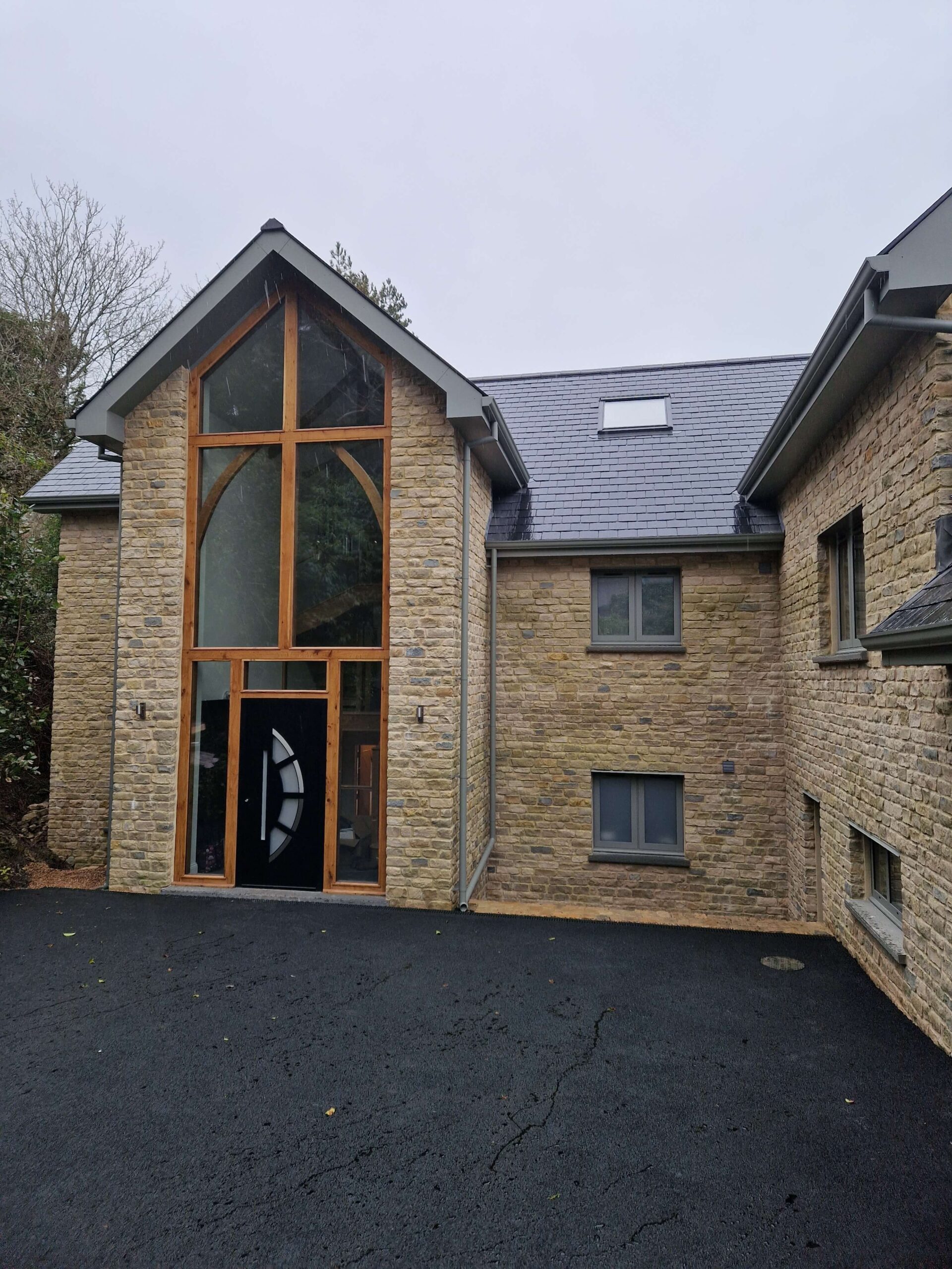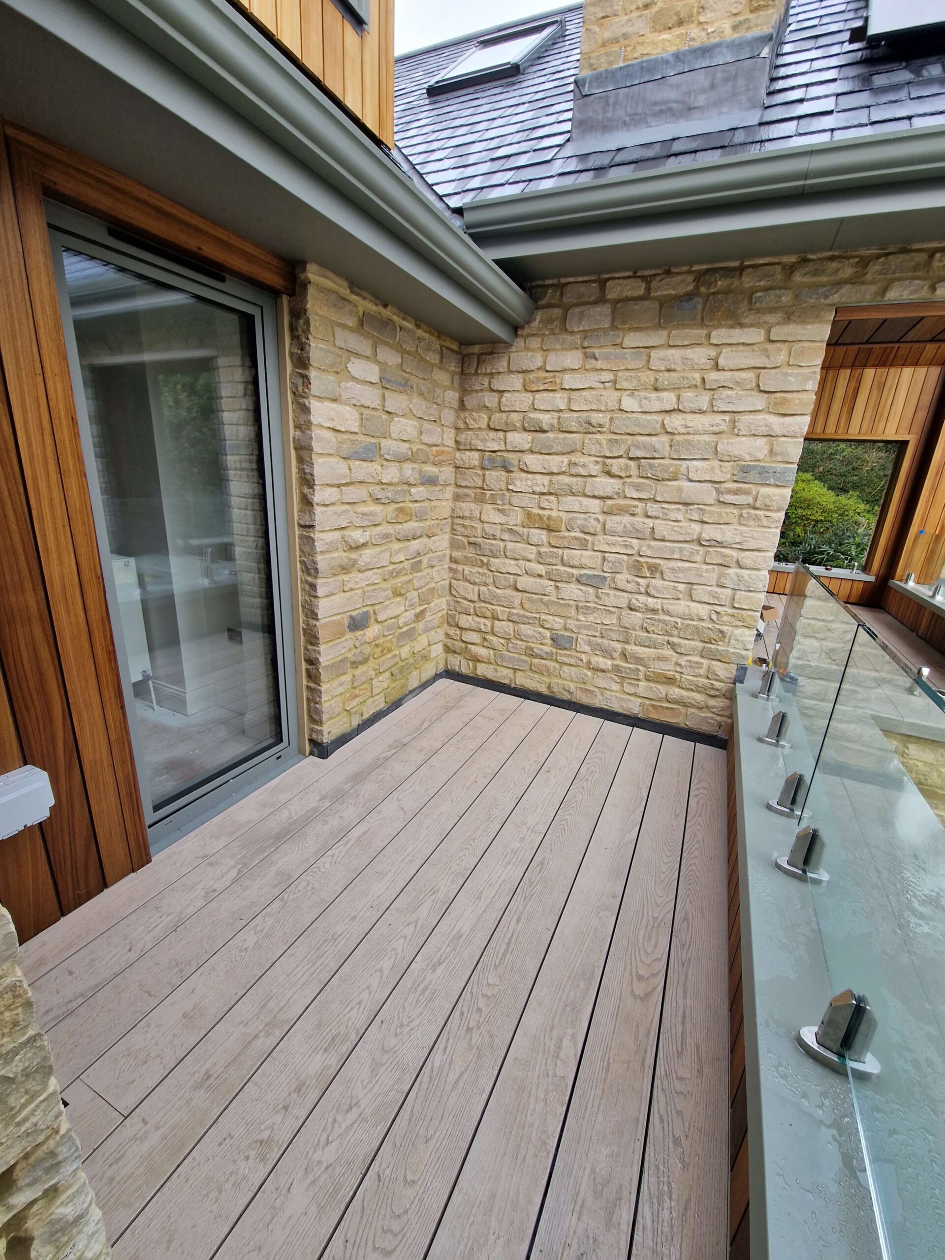 Material selection was central to achieving the desired blend of tradition and contemporary style.  We chose Green oak,  prepared and cut on site, to honour the home’s heritage and provide warmth.  Stone sourced from the Cotswolds added character,  while bespoke aluminium facia, soffit and guttering introduced a modern touch.  African wood cladding added richness and texture to the exterior.    Each element was carefully considered to balance warmth and timeless charm with modern design.