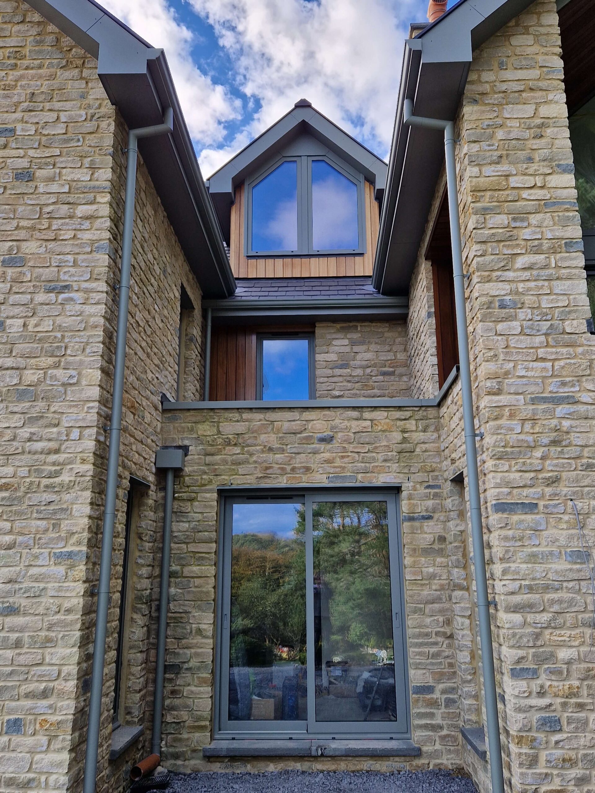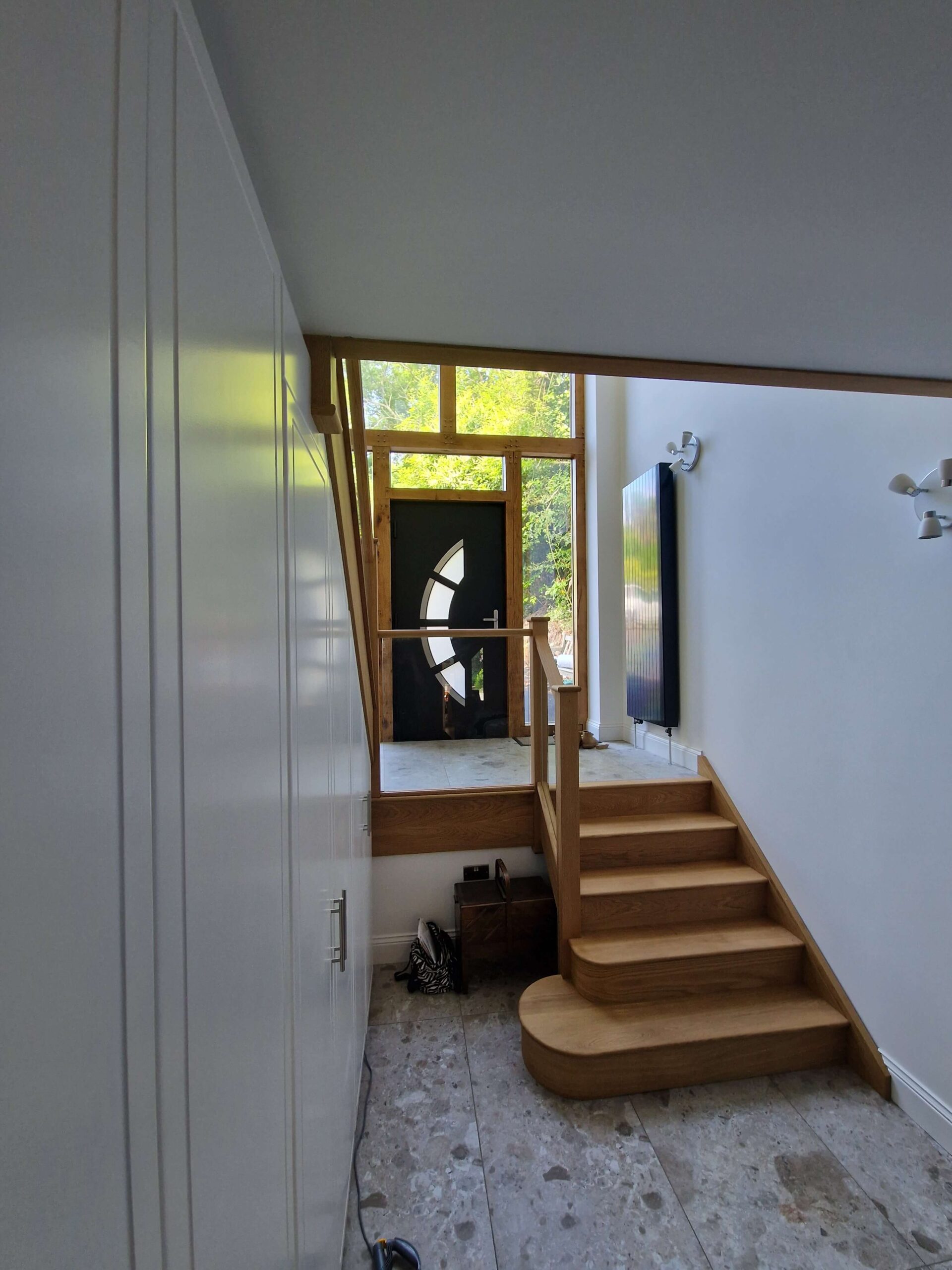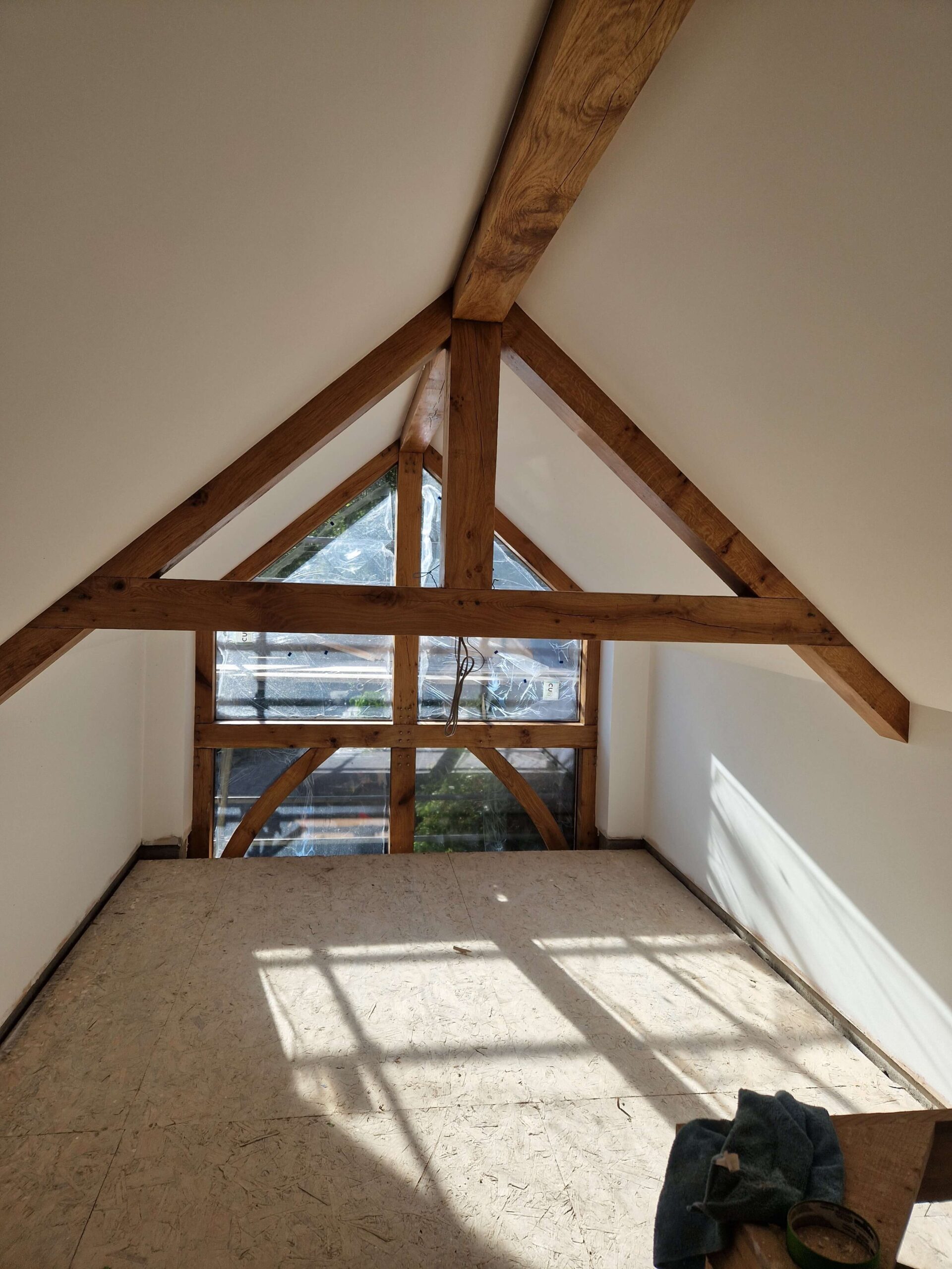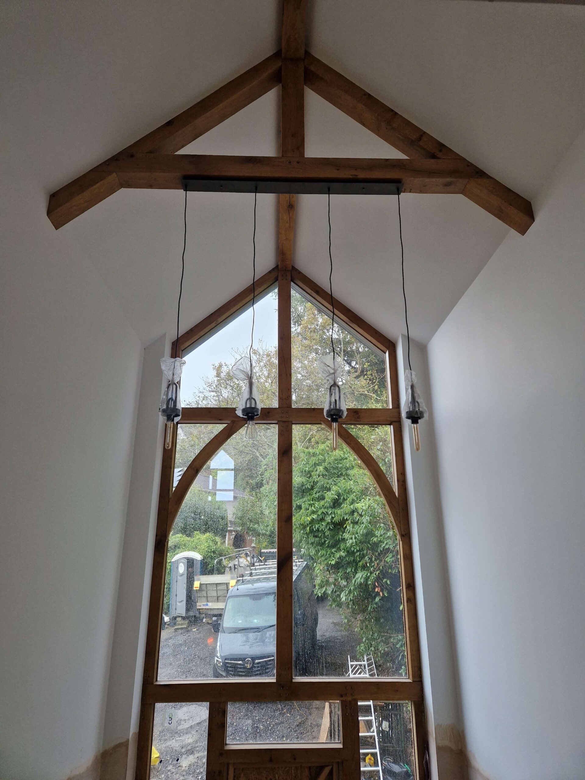 Material selection was central to achieving the desired blend of tradition and contemporary style.  We chose Green oak,  prepared and cut on site, to honour the home’s heritage and provide warmth.  Stone sourced from the Cotswolds added character,  while bespoke aluminium facia, soffit and guttering introduced a modern touch.  African wood cladding added richness and texture to the exterior.    Each element was carefully considered to balance warmth and timeless charm with modern design.