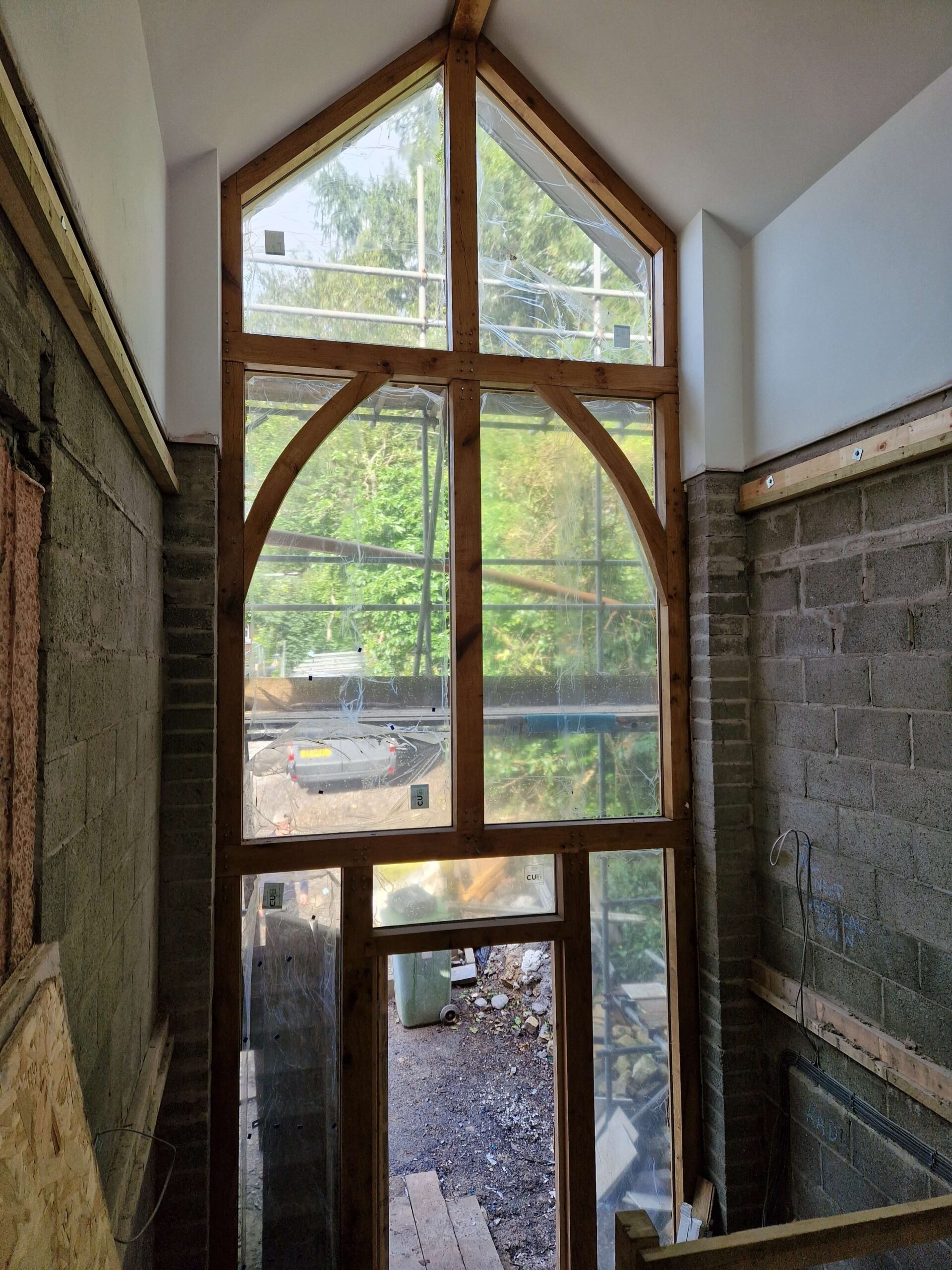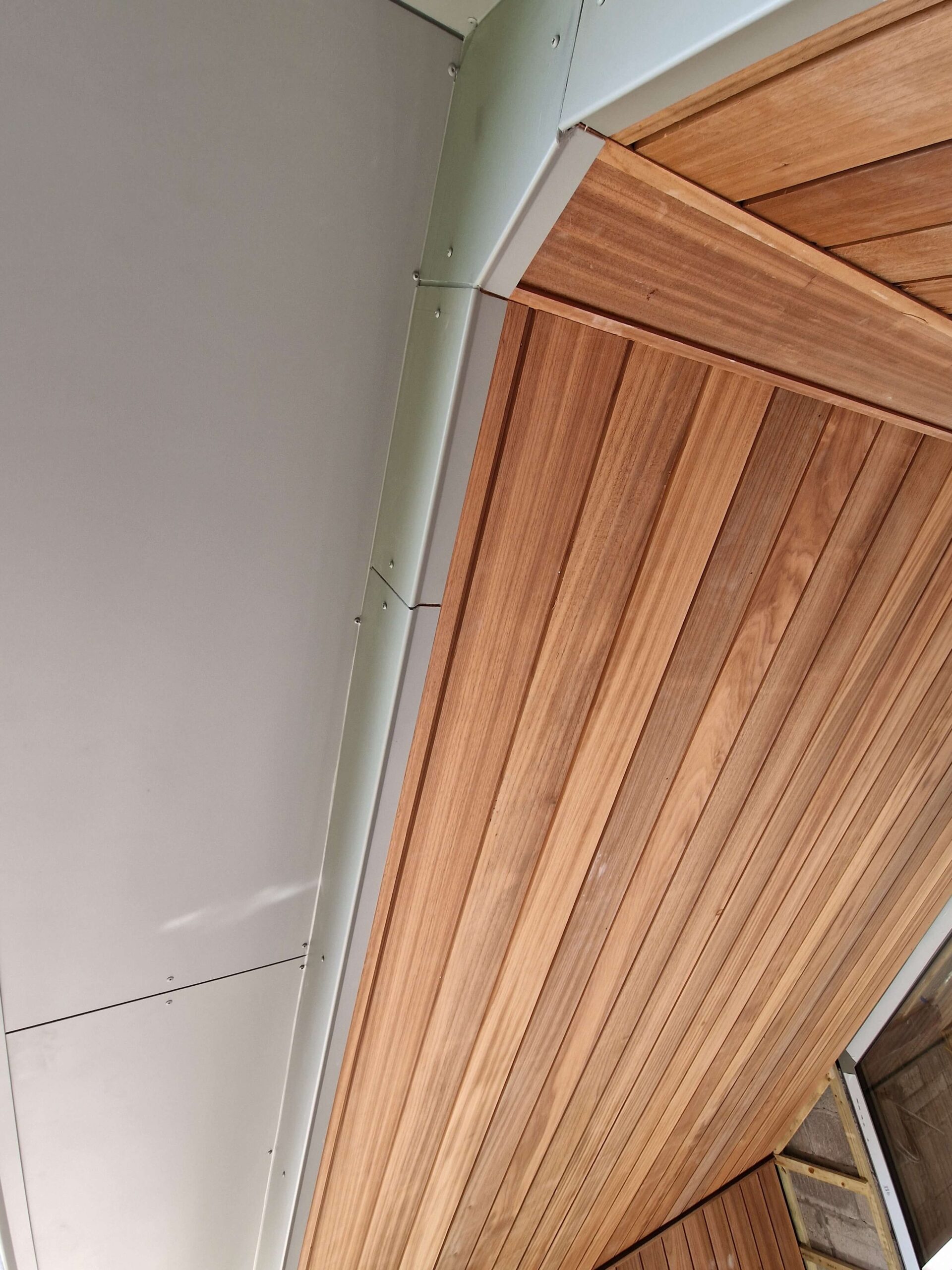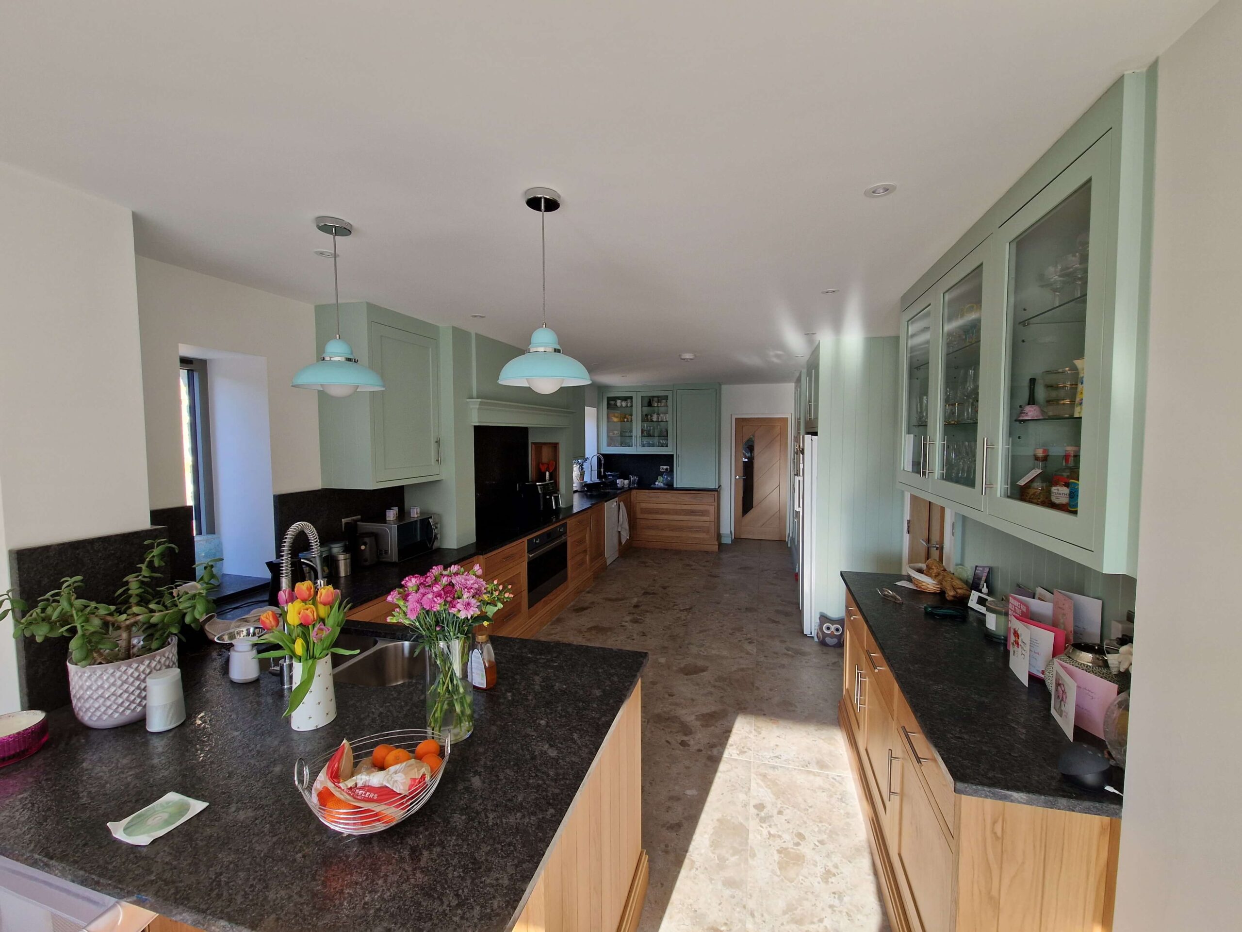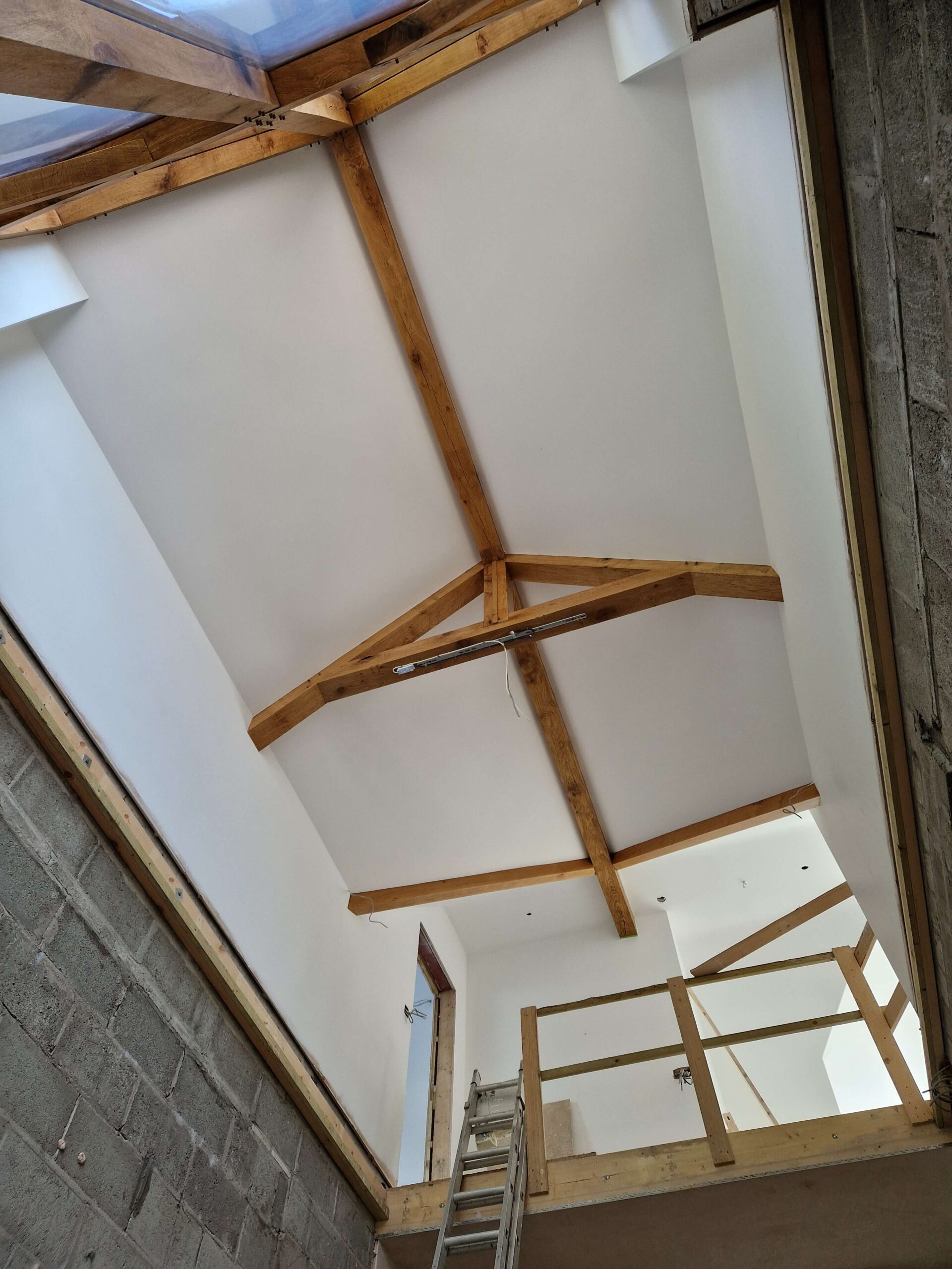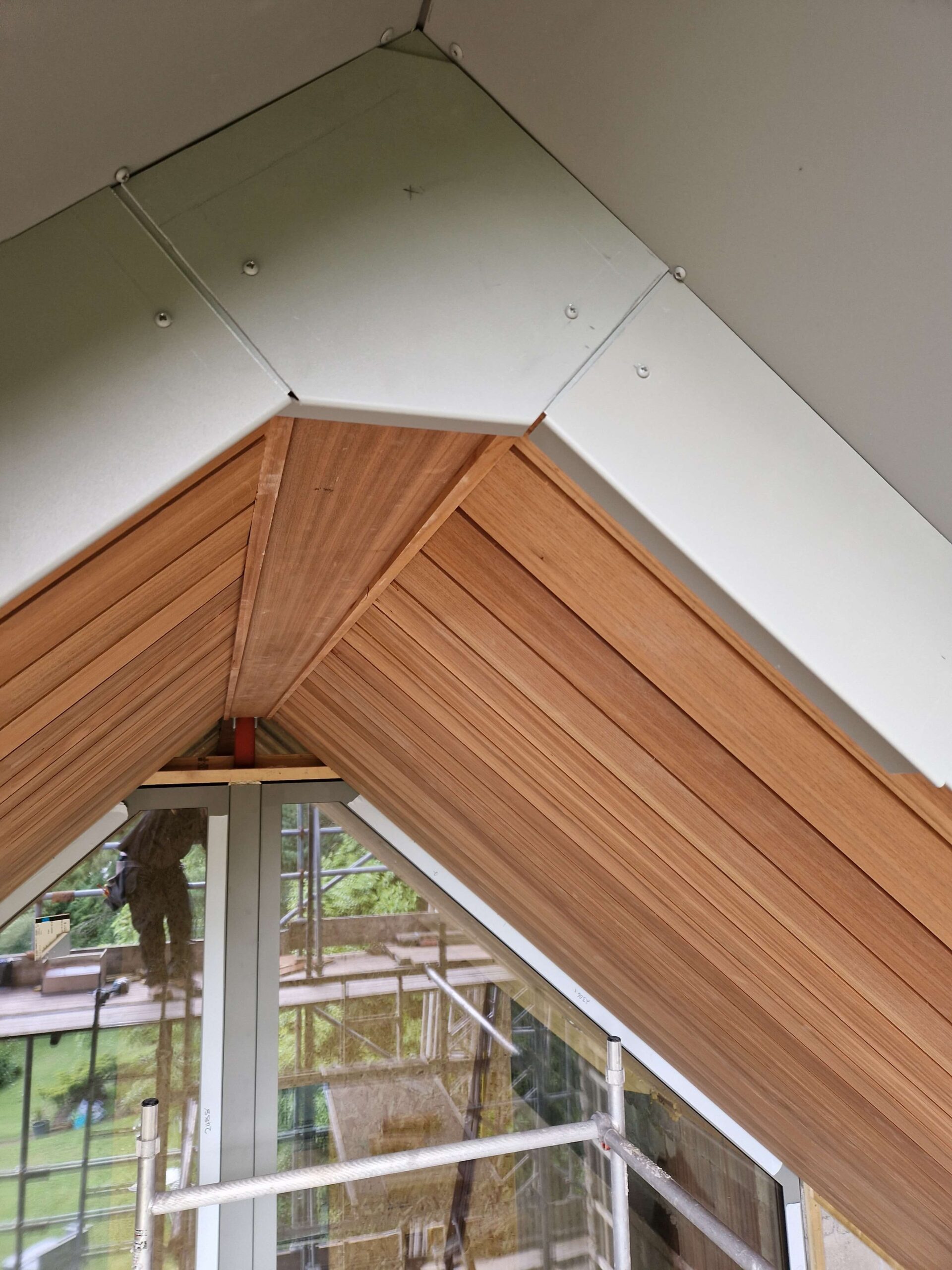 Material selection was central to achieving the desired blend of tradition and contemporary style.  We chose Green oak,  prepared and cut on site, to honour the home’s heritage and provide warmth.  Stone sourced from the Cotswolds added character,  while bespoke aluminium facia, soffit and guttering introduced a modern touch.  African wood cladding added richness and texture to the exterior.    Each element was carefully considered to balance warmth and timeless charm with modern design.