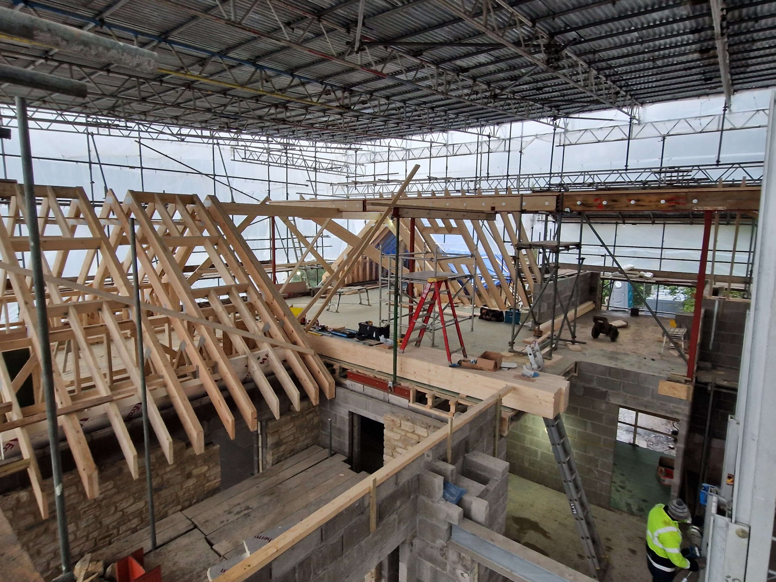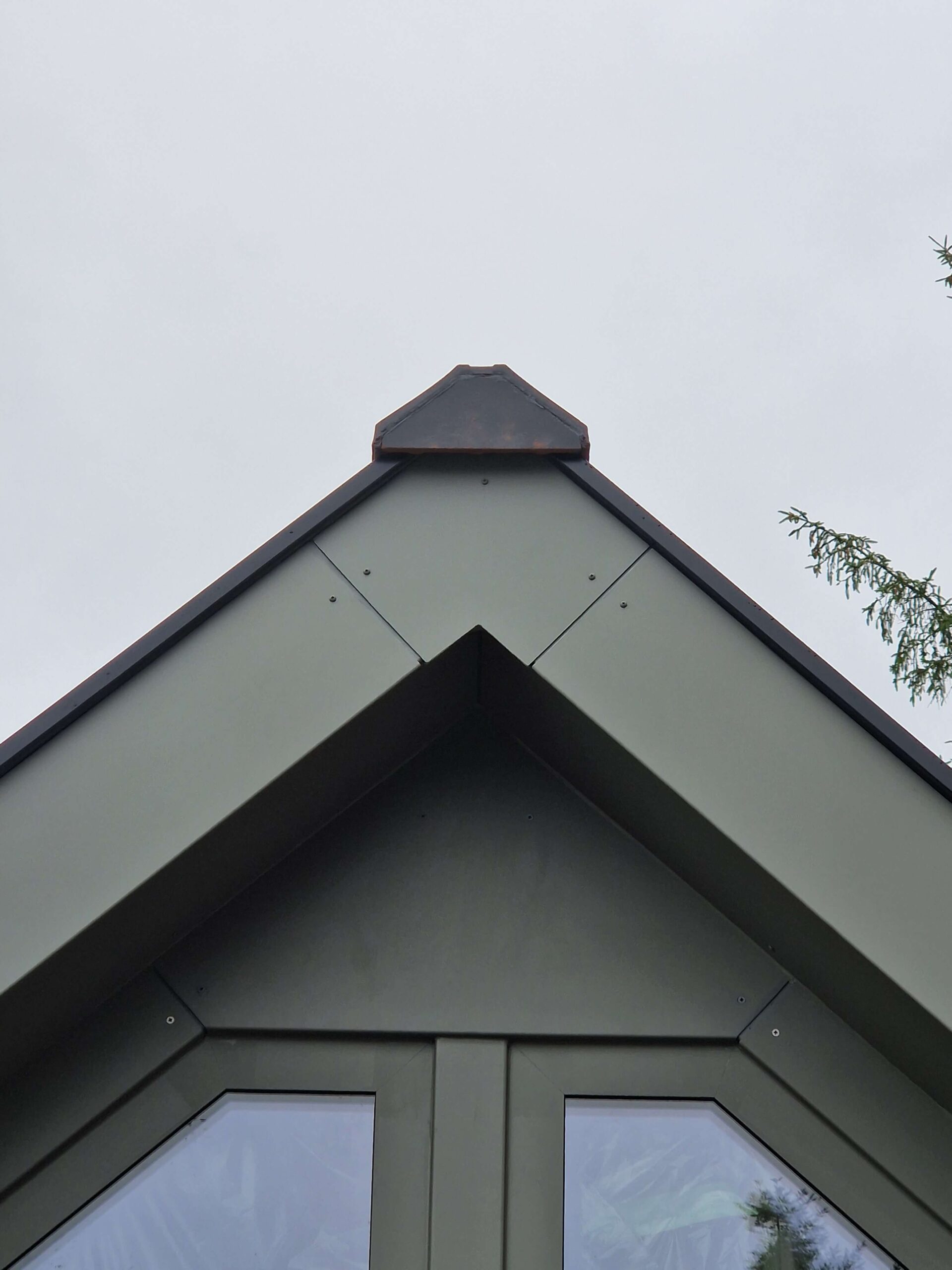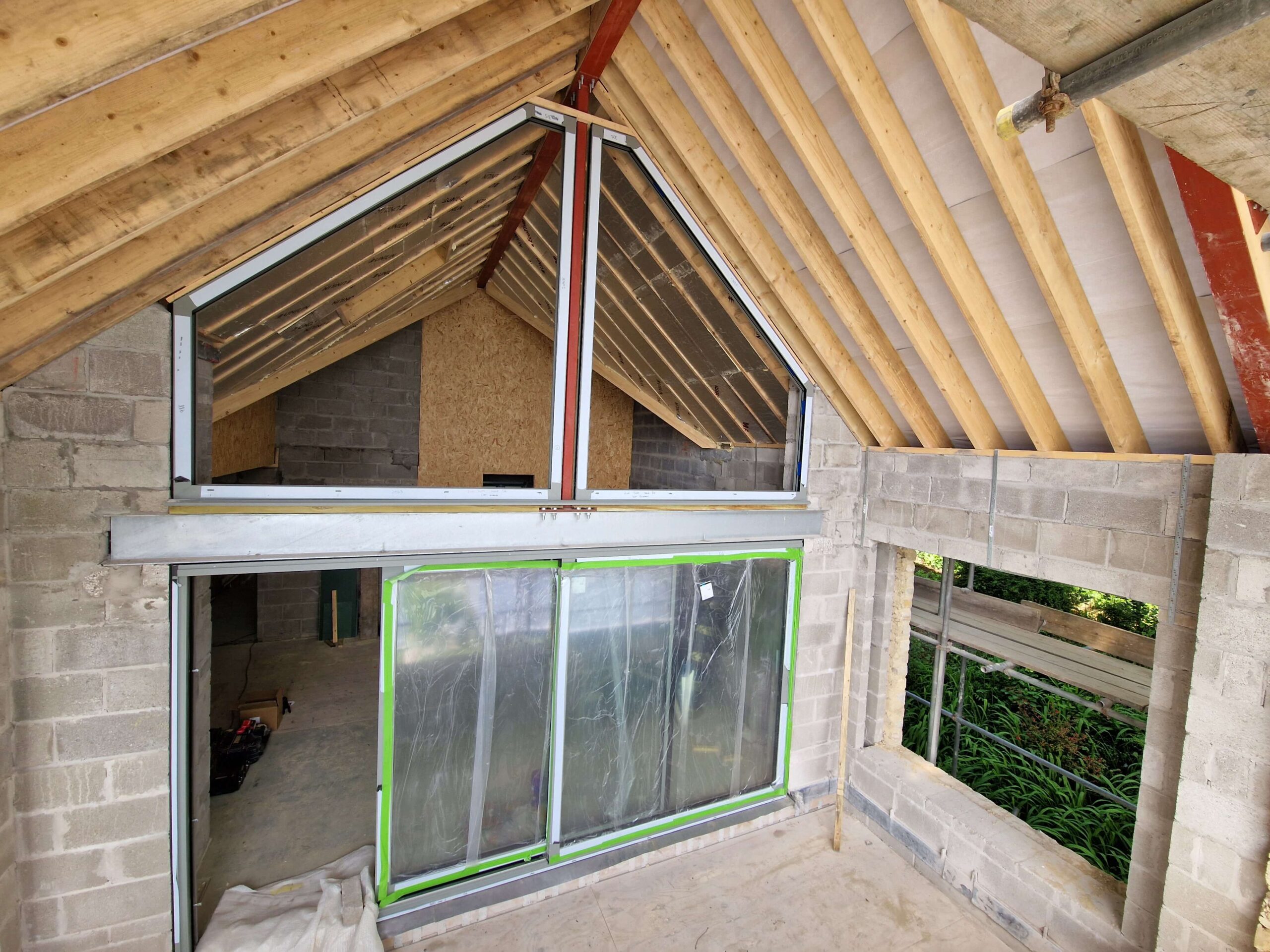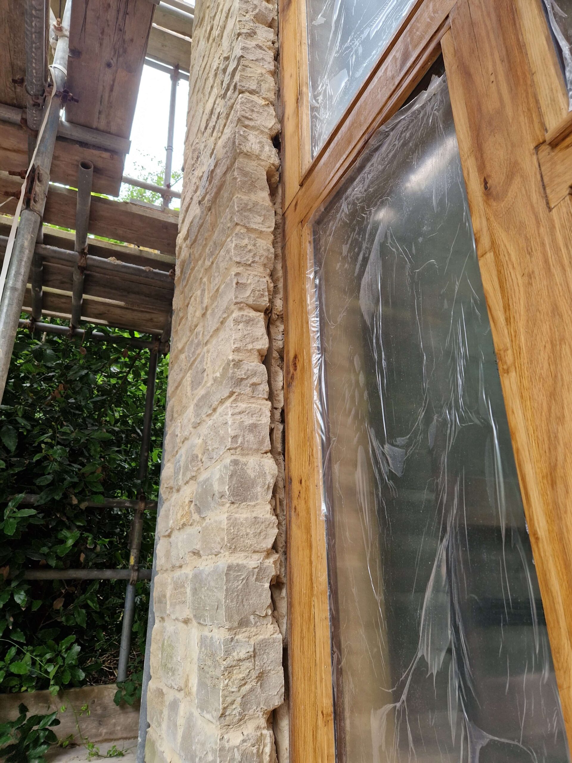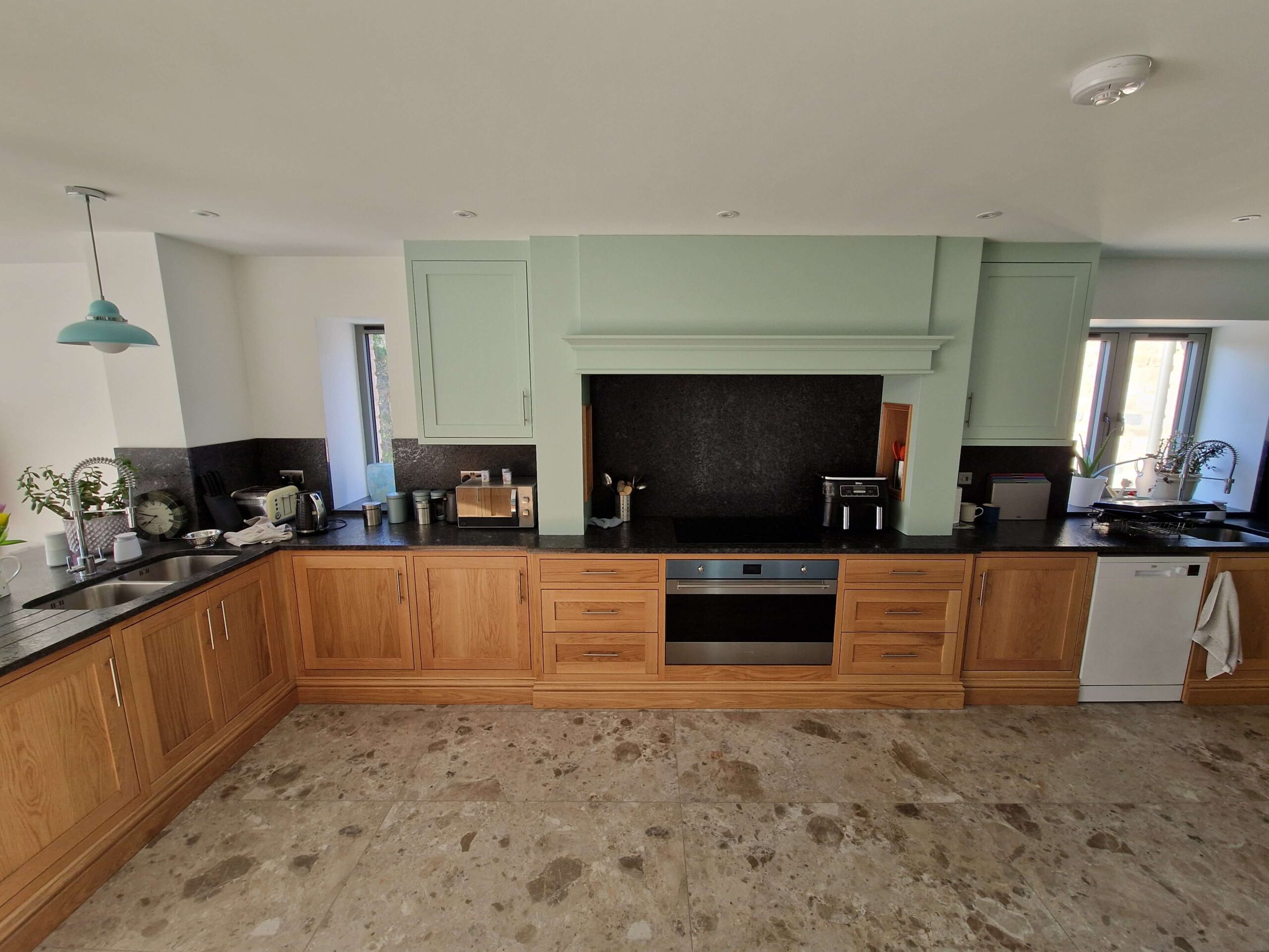 Material selection was central to achieving the desired blend of tradition and contemporary style.  We chose Green oak,  prepared and cut on site, to honour the home’s heritage and provide warmth.  Stone sourced from the Cotswolds added character,  while bespoke aluminium facia, soffit and guttering introduced a modern touch.  African wood cladding added richness and texture to the exterior.    Each element was carefully considered to balance warmth and timeless charm with modern design.
