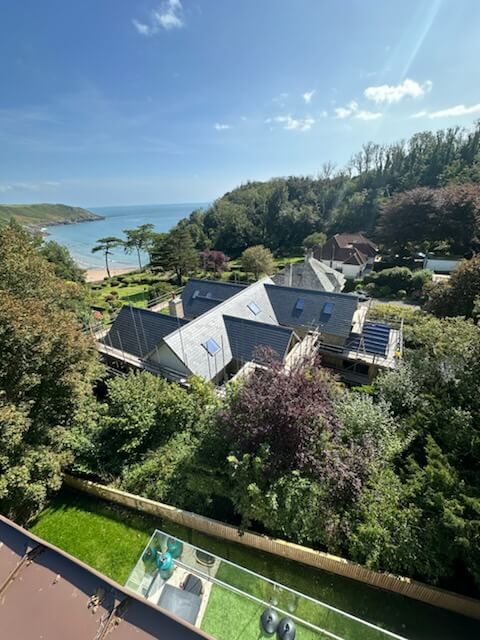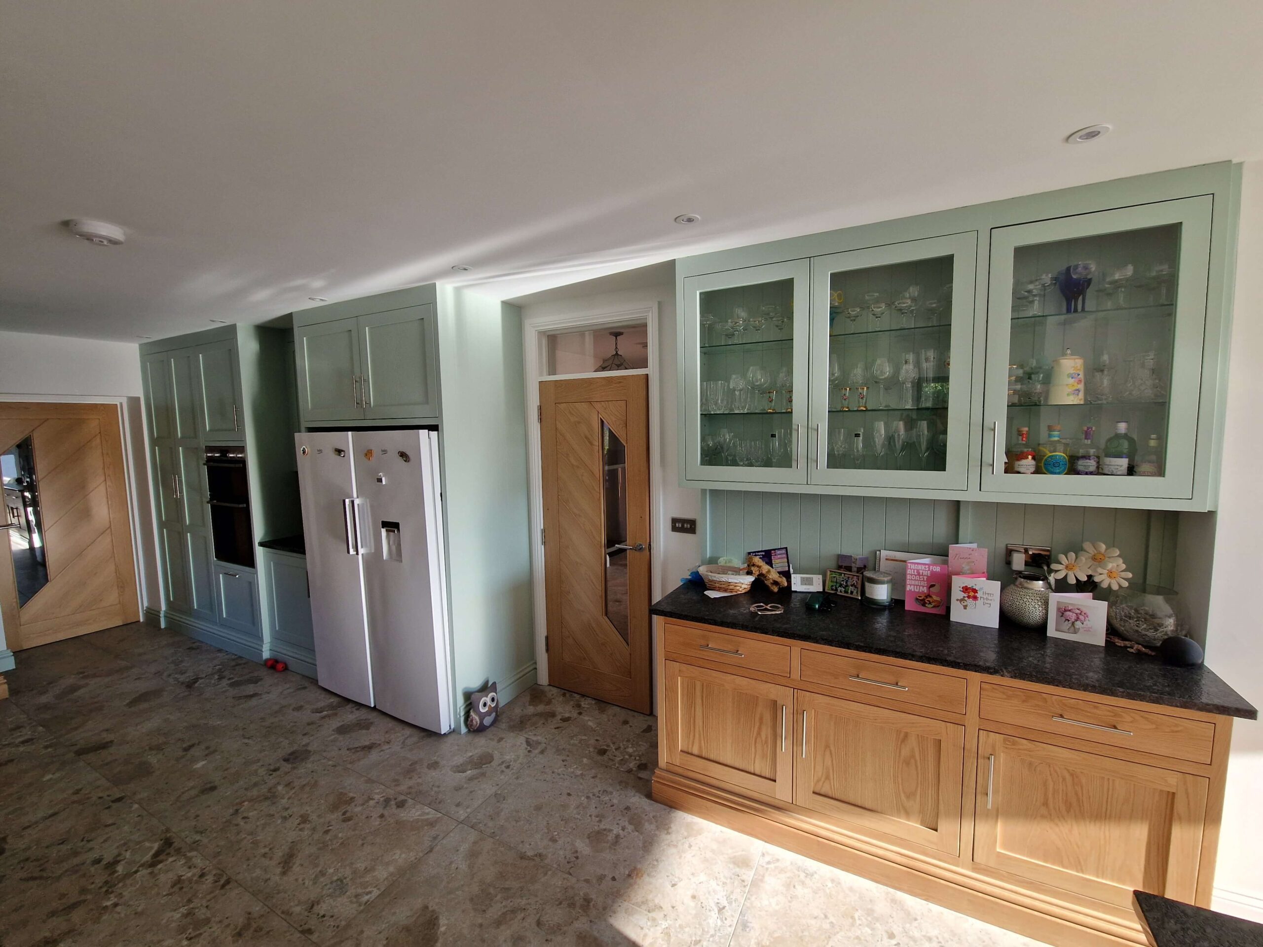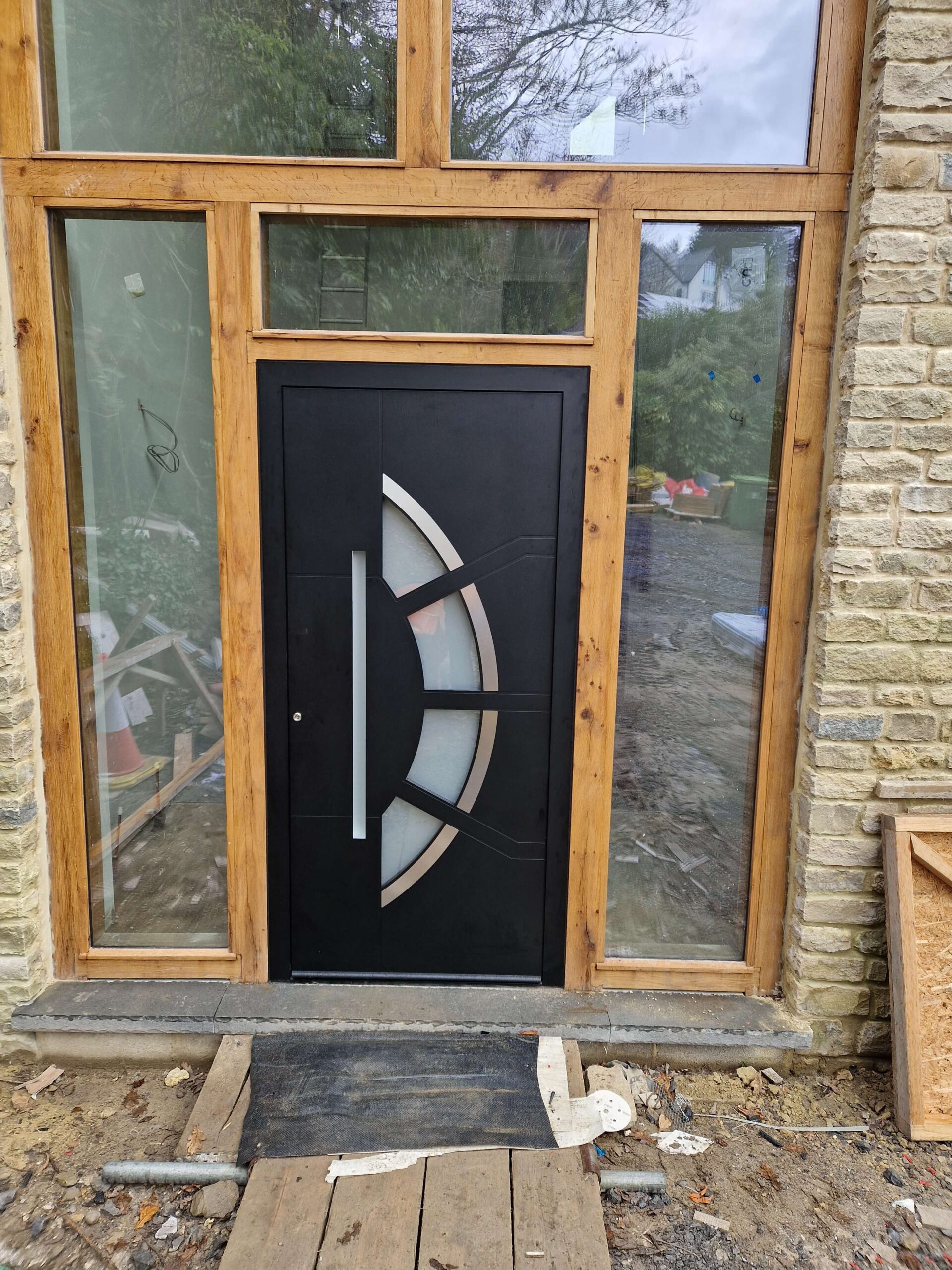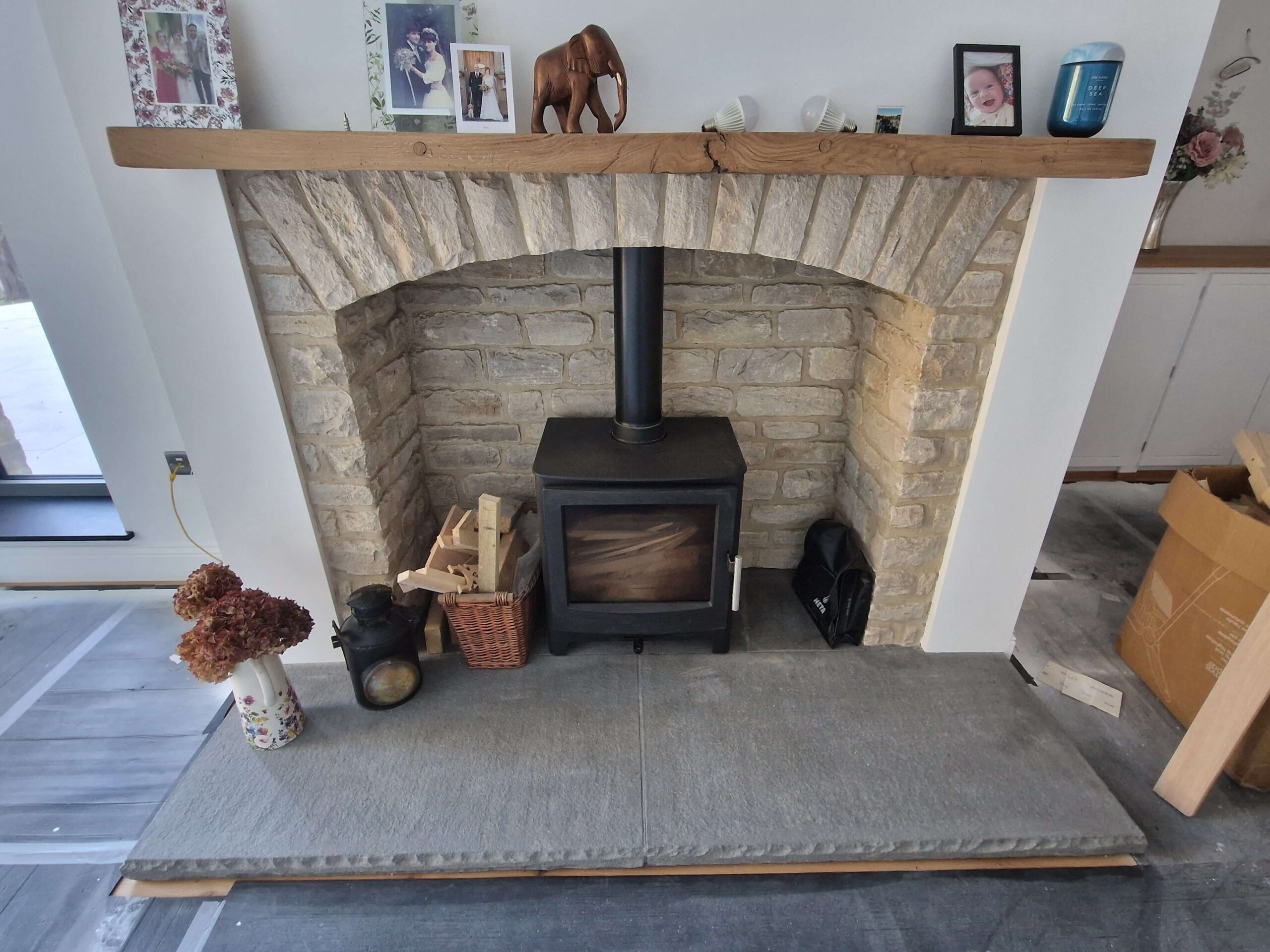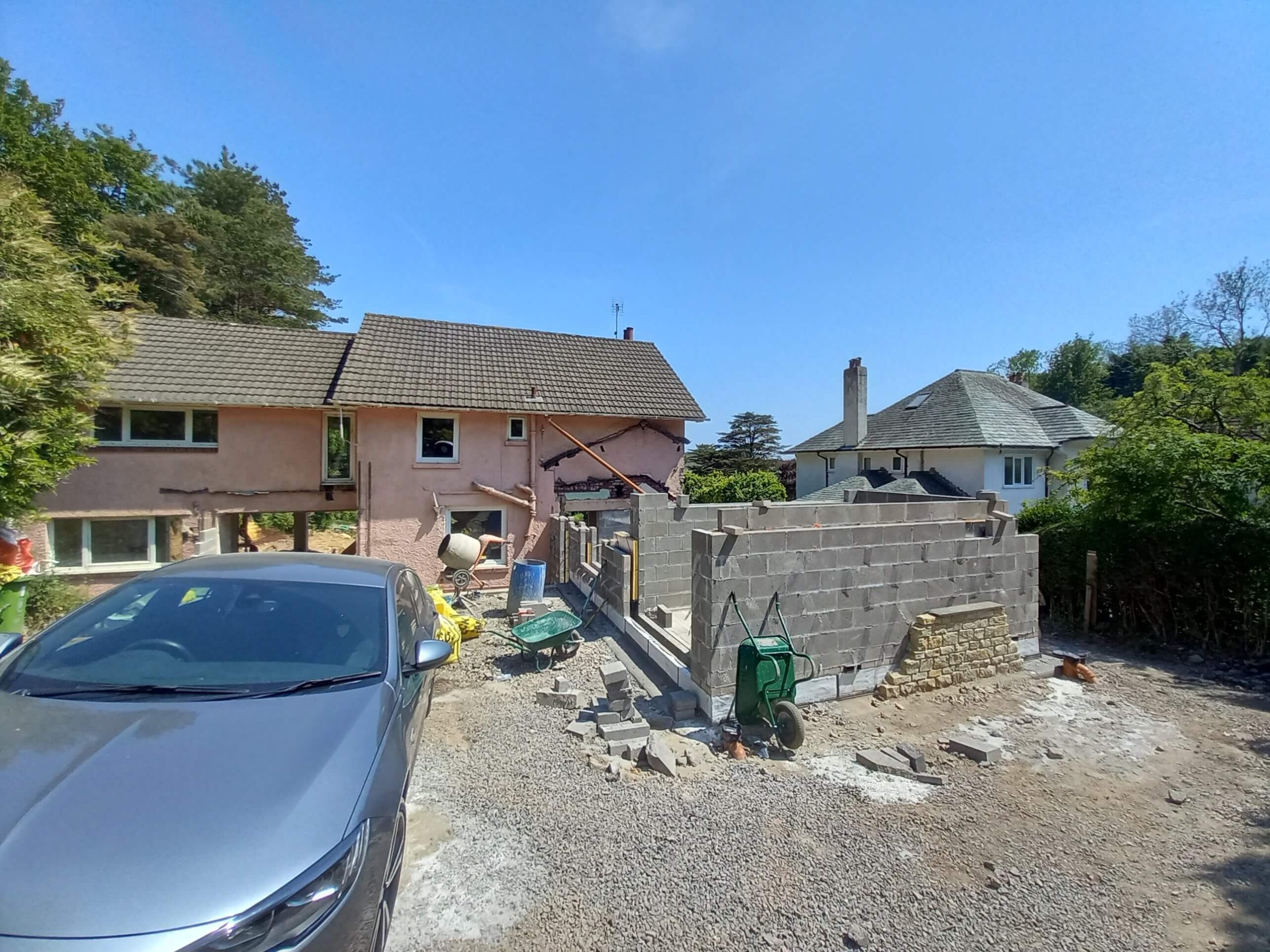 Material selection was central to achieving the desired blend of tradition and contemporary style.  We chose Green oak,  prepared and cut on site, to honour the home’s heritage and provide warmth.  Stone sourced from the Cotswolds added character,  while bespoke aluminium facia, soffit and guttering introduced a modern touch.  African wood cladding added richness and texture to the exterior.    Each element was carefully considered to balance warmth and timeless charm with modern design.